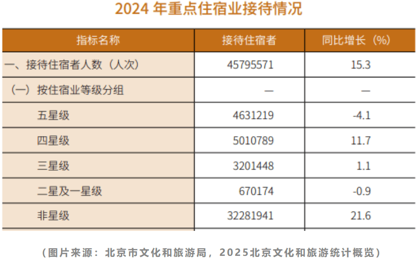 根據(jù)北京市文化和旅游局的統(tǒng)計數(shù)據(jù),2024年,北京市的住宿業(yè)接待情況中,總接待住宿者同比增長15.3%,但五星級酒店的同比下降4.1%。更宏觀的數(shù)據(jù)來自文旅部:2020年我國五星級酒店數(shù)量850家,截至2024年第三季度,五星級酒店僅736家,五年內(nèi)減少了114家,高端住宿市場收縮已成不爭的事實。
