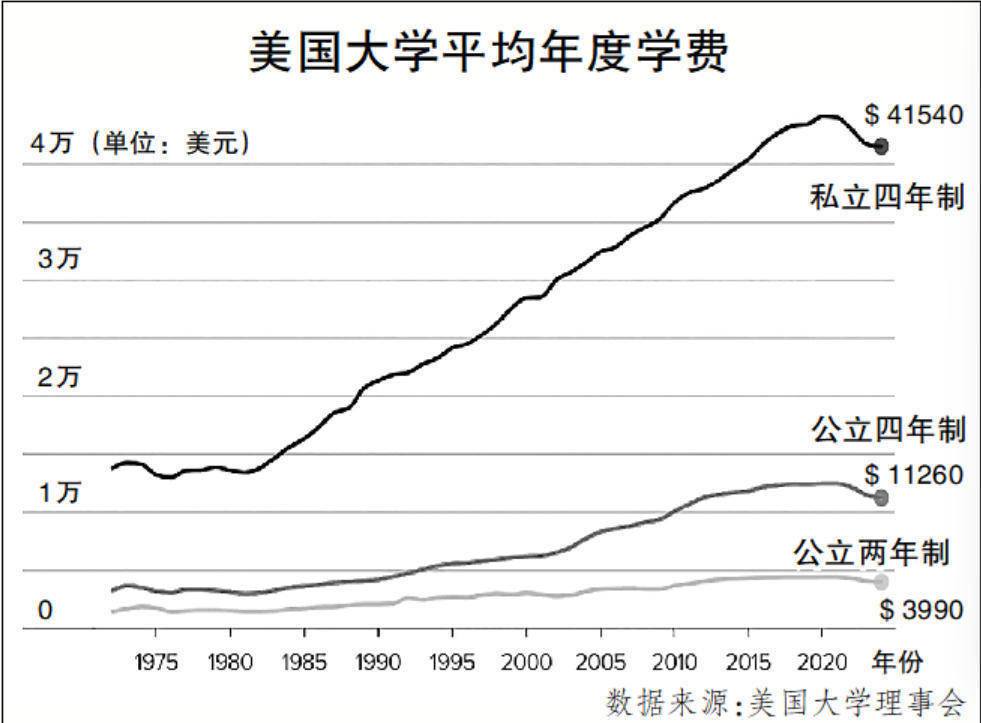 “隨著秋季學(xué)期臨近,美國大學(xué)高昂的費(fèi)用正成為大多數(shù)學(xué)生的沉重負(fù)擔(dān)。”美國CNBC網(wǎng)站8月的一篇報道援引美國公民金融集團(tuán)最新調(diào)查顯示,盡管59%的家長在孩子被美國大學(xué)錄取時對支付學(xué)費(fèi)充滿信心,但當(dāng)學(xué)費(fèi)賬單抵達(dá)后,這一比例驟降至21%,暴露出巨大的“信心落差”。數(shù)據(jù)顯示,近年來,美國大學(xué)費(fèi)用持續(xù)攀升。摩根大通資產(chǎn)管理報告顯示,自1983年以來,美國大學(xué)學(xué)費(fèi)年均上漲5.6%,遠(yuǎn)超通脹率。據(jù)統(tǒng)計,越來越多美國大學(xué)年學(xué)費(fèi)接近或突破10萬美元大關(guān),且仍以每年約5%的速度增長。