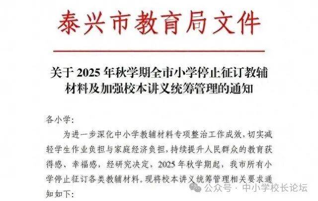 為持續(xù)深化中小學(xué)教輔材料專項(xiàng)整治成效,切實(shí)減輕學(xué)生作業(yè)負(fù)擔(dān)與家庭經(jīng)濟(jì)負(fù)擔(dān),不斷提升人民群眾的教育獲得感、幸福感,近日,泰州泰興市教育局印發(fā)《關(guān)于2025年秋學(xué)期全市小學(xué)停止征訂教輔材料及加強(qiáng)校本講義統(tǒng)籌管理的通知》,明確2025年秋學(xué)期起,全市所有小學(xué)停止征訂教輔材料,并就校本講義統(tǒng)籌管理工作作出詳細(xì)部署,為“雙減”工作落地生效再添“實(shí)招”。