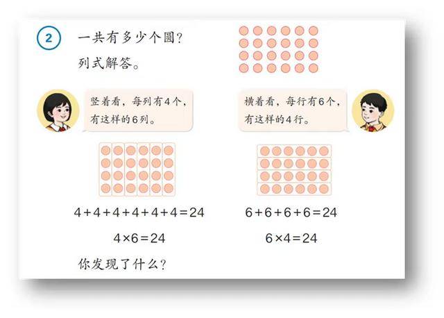 例2提供了圓片模型,這里的模型就比較抽象,從兩個方向看可以得出兩個算式(4x6,6x4),但它們結果是一致的,溝通了它們之間的聯系。對于實際教學時,在教學完例2之后,要求學生列出乘法算式的題目,雖然按照約定應該將相同加數寫在前面,但如果學生將相同加數及其個數的位置寫顛倒了,教師評價時也盡量寬松些。