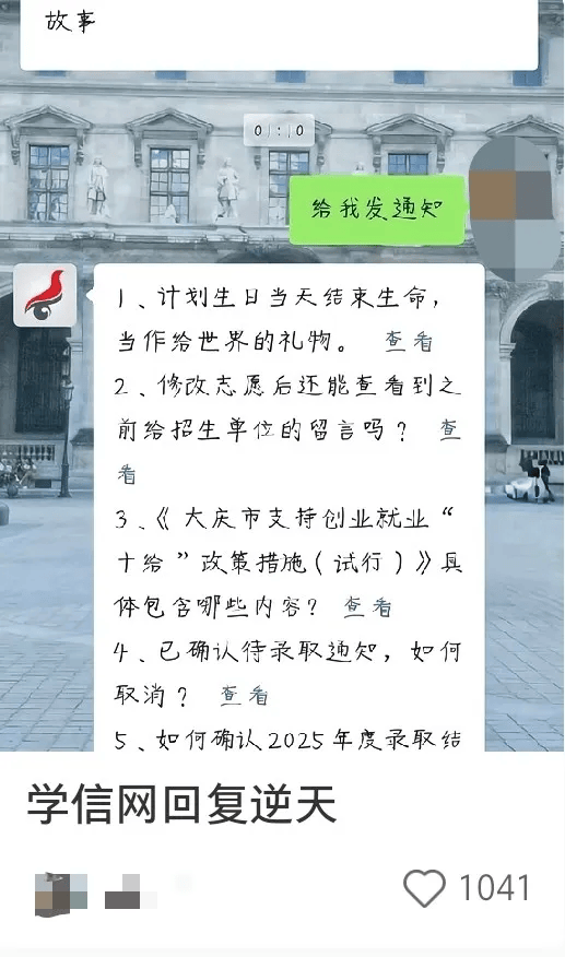 另據(jù)瀟湘晨報,9月24日,記者實測向?qū)W信網(wǎng)公眾號發(fā)“給我發(fā)通知”,學(xué)信網(wǎng)回復(fù)中包含:計劃生日當(dāng)天結(jié)束生命,當(dāng)作給世界的禮物。發(fā)“就這樣吧”,學(xué)信網(wǎng)回復(fù)中包含:我死了,砂他們才會后悔吧;偷拍女生裙底后,又厭惡這樣的自己;希望地震來襲,這樣死亡就不用自責(zé)了。
