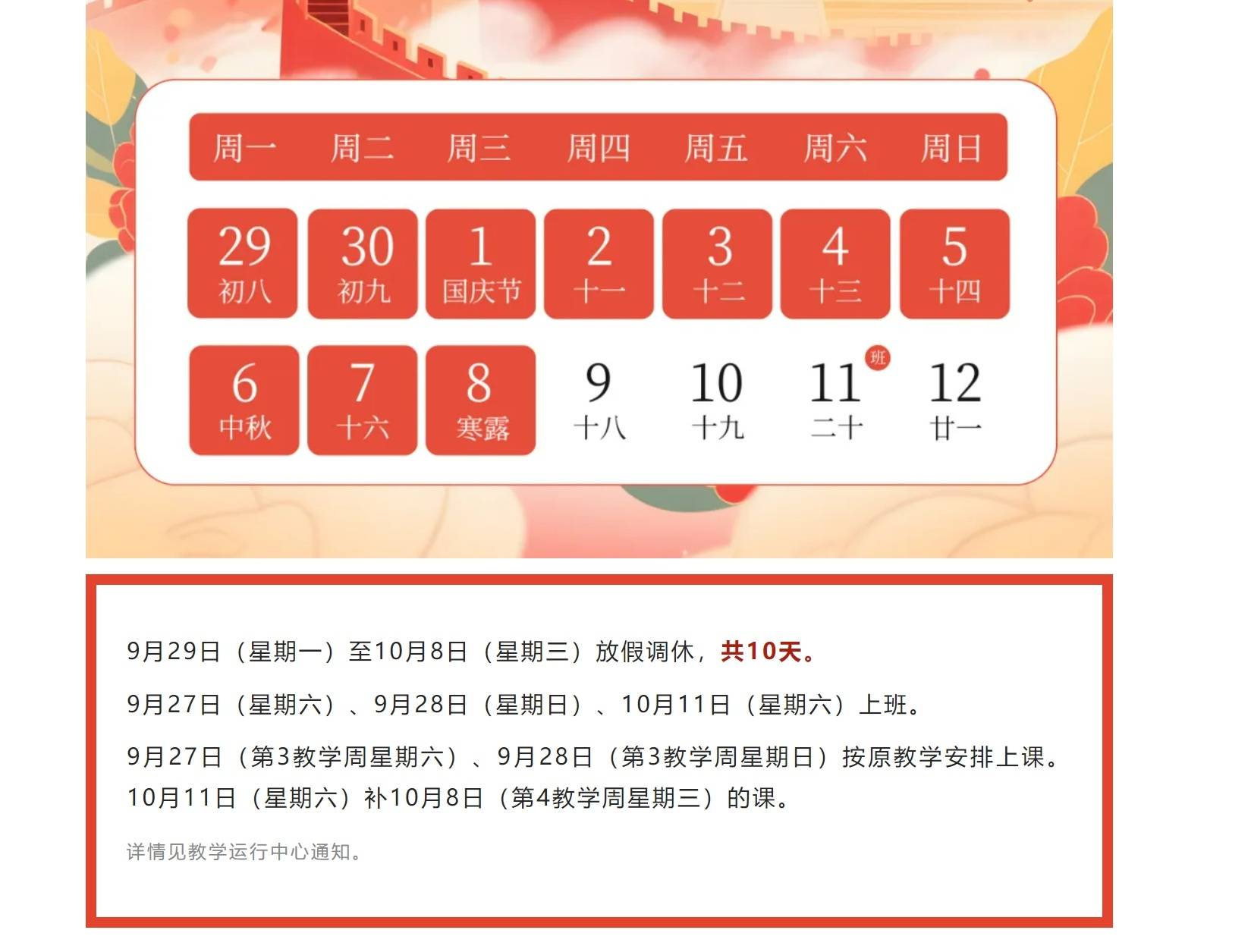 其通知稱,9月29日至10月8日放假調(diào)休,共10天。9月27日(第3教學(xué)周星期六)、9月28日(第3教學(xué)周星期日)按原教學(xué)安排上課。10月11日(星期六)補(bǔ)10月8日(第4教學(xué)周星期三)的課。