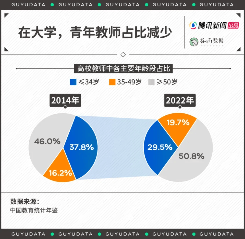 根據《中國教育統計年鑒》數據,從2014年到2022年,34歲及以下高校教師的占比從37.8%降至29.5%。與大家預期不同,院校吸納年輕人才的能力并無上升。