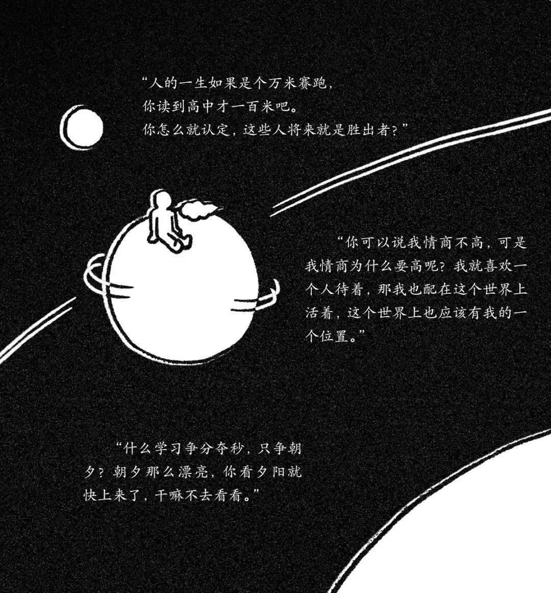 這些年,我看過各種各樣的學生,但我看到很多人都陷入了既定的狹隘軌道。這些優(yōu)秀的孩子,被囚禁在別人目光的牢籠中,逐漸變得平庸和功利。很多學生在學習里找不到興趣,只是為了要贏過其他同學,要贏得老師和家長欣賞的目光。優(yōu)績主義強調(diào)競爭、強調(diào)杰出、強調(diào)不斷地精進,但是它對成功的定義太狹隘,標準太單一,讓人失去了太多的生命力。