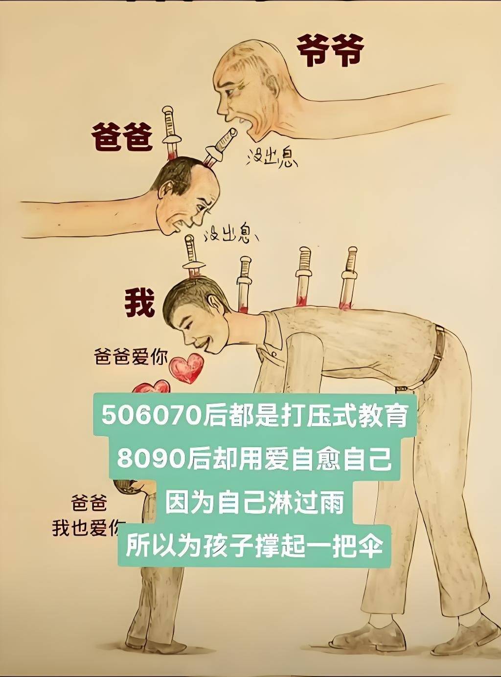 網(wǎng)上最近流傳一張圖,爺爺、爸爸,都承受著打壓式教育,但身為父母的“我”,卻決定貫徹“愛的教育”,這就是“自我決定論”的完美體現(xiàn)。