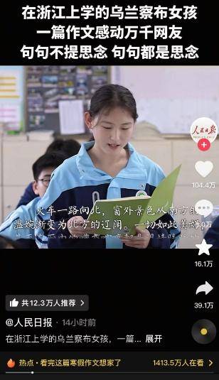近日,《人民日報(bào)》轉(zhuǎn)發(fā)的杭州市丁蘭實(shí)驗(yàn)中學(xué)初三學(xué)生張瀟冉的一段視頻,獲得百萬點(diǎn)贊。視頻中,她為全班同學(xué)朗讀自己寫的一篇作文《舊軌回鄉(xiāng)》。張瀟冉的故鄉(xiāng),內(nèi)蒙古烏蘭察布的一些官方賬號(hào)也轉(zhuǎn)發(fā)了這個(gè)視頻,引起強(qiáng)烈的反響。