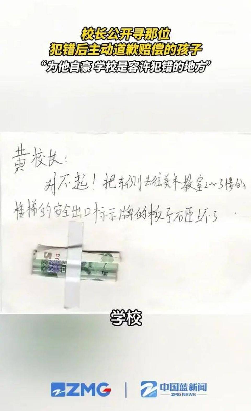 近日,杭州余杭一位校長在大會上公開尋找一名犯錯后主動道歉賠償的孩子。這個學生弄壞了樓梯的安全出口標示牌后,寫了一封道歉信,還留下50元作為賠償。校長沒有責備他,也沒有冷處理,而是當著全校師生的面請他上臺,還說道,“為他感到自豪,學校是容許同學們犯錯的地方”。