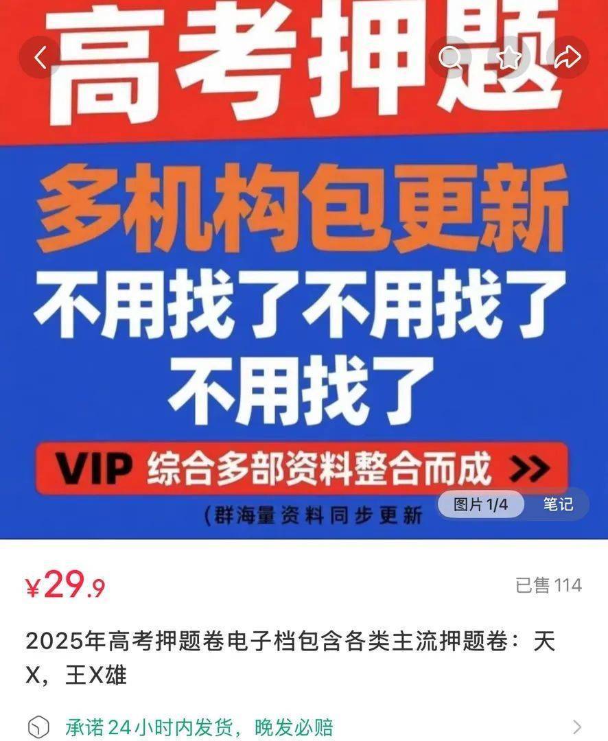 “目前已經出了大部分,五月份會全部出完。”記者咨詢一位賣家,對方發來一份資料截圖,稱已上傳了十余家機構所出押題卷,后面還會陸續更新王后雄、天星、張雪峰等所出的押題卷。“包更新,以后掛上去的也都可以下載。”該賣家已獲114份銷量。