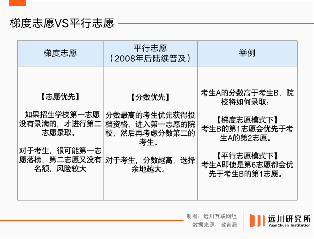 整體而言,高考志愿填報機制經(jīng)歷了兩個重要轉(zhuǎn)變:從估分報志愿轉(zhuǎn)向知分報志愿(1995年后),從梯度志愿轉(zhuǎn)向平行志愿(2008年后)。