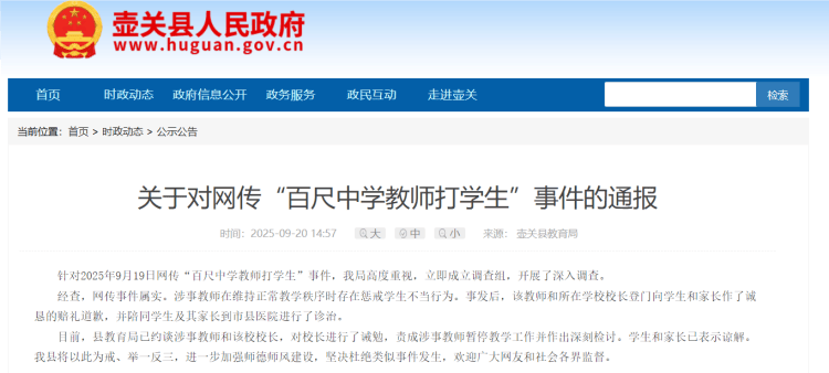 山西省長治市壺關縣教育局9月20日發布關于對網傳“百尺中學教師打學生”事件的通報: