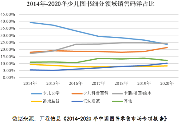 少兒圖書又可以細分為少兒文學、少兒科普百科、卡通/漫畫/繪本、游戲益智、低幼啟蒙、其他等 6 大類。其他包括少兒藝術、少兒國學經典、少兒英語、卡片掛圖、青少年心理自助。2020 年卡通/漫畫/繪本超過少兒文學,成為少兒圖書市場的第一大細分市場,市場占有率為 24.24%,其后依次為少兒文學、少兒科普百科、低幼啟蒙、游戲益智,合計占比 63.64%。