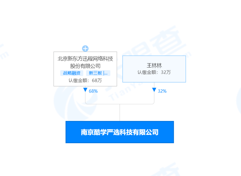 多知網12月6日消息,近日,南京酷學嚴選科技有限公司成立,注冊資本100萬元人民幣,公司控股股東為新東方在線母公司,北京新東方迅程網絡科技股份有限公司,持股比例68%。