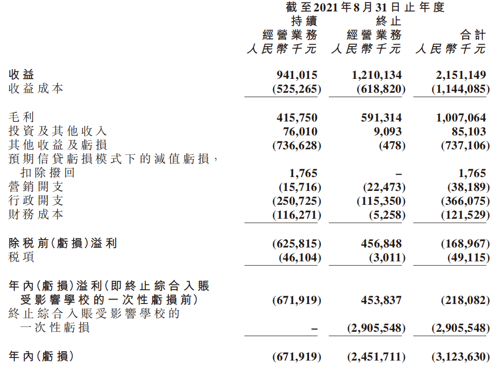 受此影響,楓葉教育“于2021年8月31日失去對受影響學校的控制權,且受影響學校終止入賬截至2021年8月31日止年度之綜合財務報表”.楓葉教育在財報中將受到影響的義務教育階段學校和非營利性幼兒園業務歸類為“終止經營業務”.