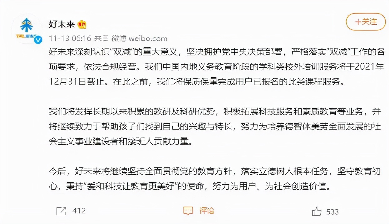 好未來官方微博于13日當天6時16分也發布了相關公告。