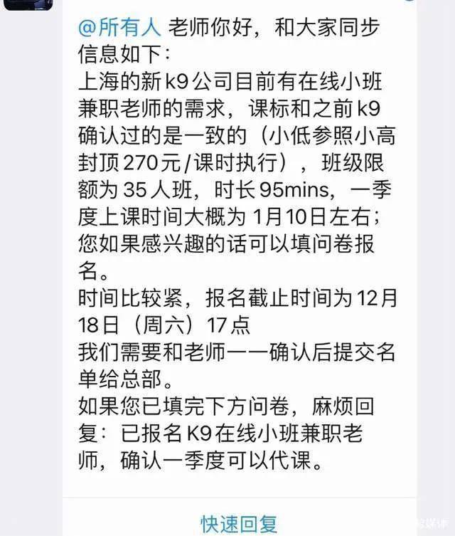 學而思老師在小紅書上傳的相關截圖顯示,上海的新K9公司尚有在線小班兼職老師的需求,上課時間大概為(2022年)1月10日左右,報名截止時間為12月18日(周六)17點。