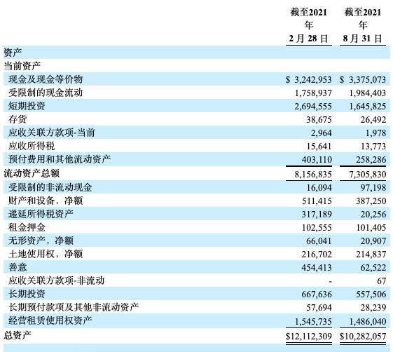 截至2021年8月31日,好未來總資產為102.82億美元,其中現金及現金等價物為33.75億美元,受限資金19.84億美元,短期投資16.46億美元;負債61.03億美元,其中流動遞延收入為11.11億美元。