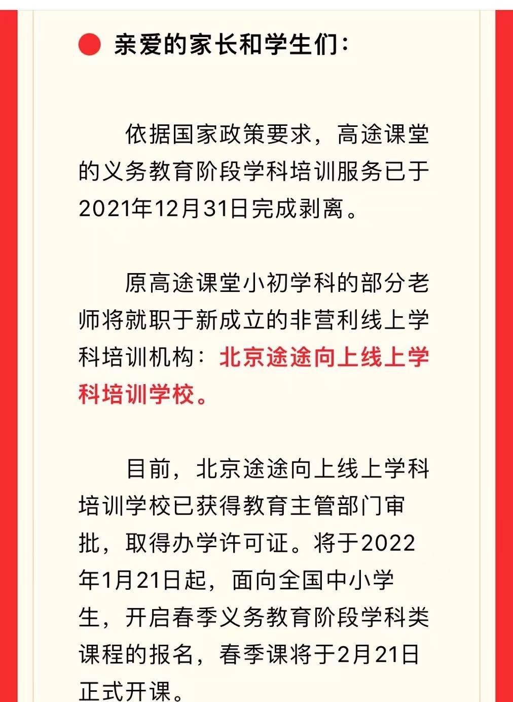 緊跟著,高途課堂也宣布,原高途課堂小初學科的部分老師將就職于新成立的非營利線上學科培訓機構:北京途途向上線上學科培訓學校。