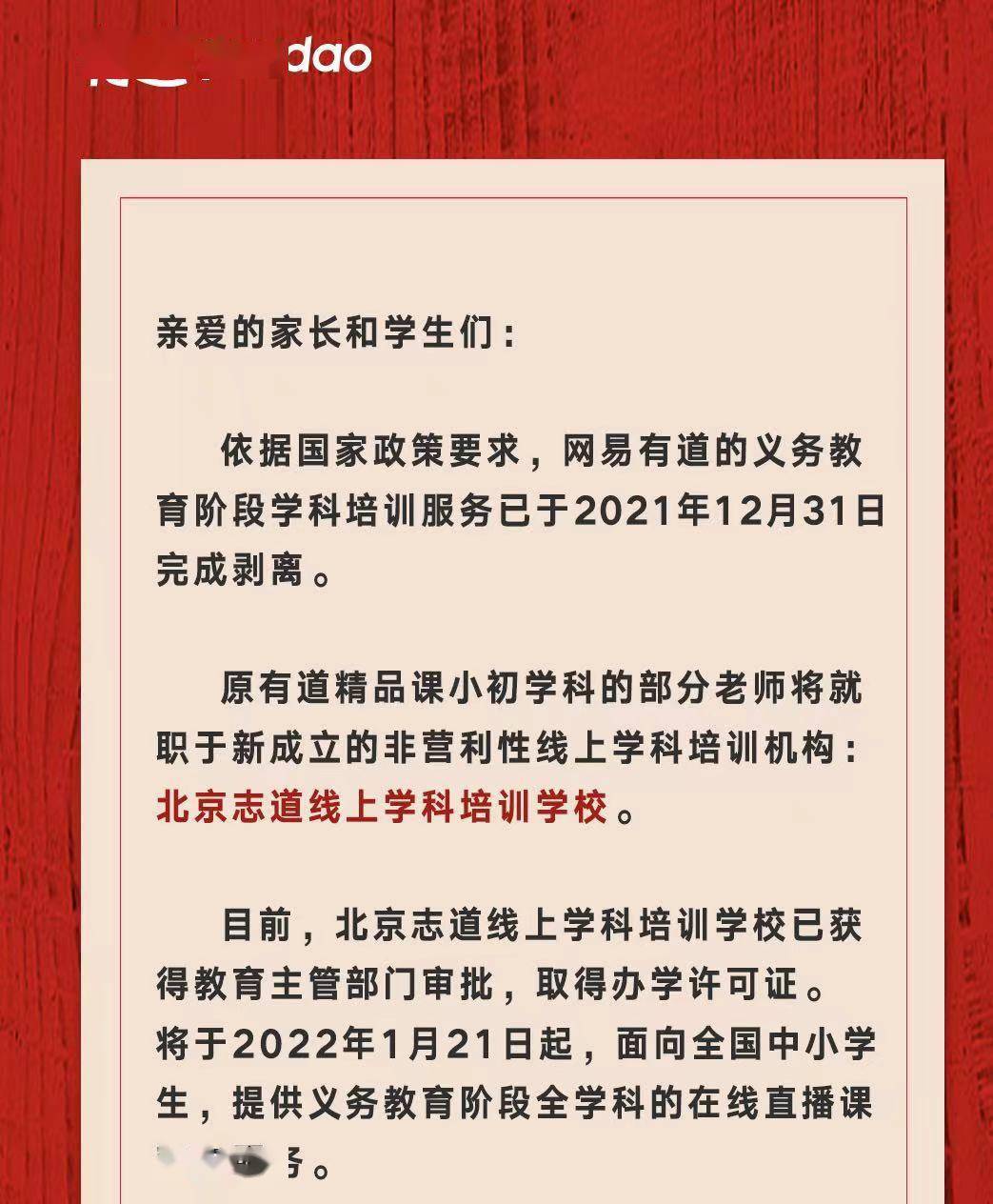網易有道還提到,目前,北京志道線上學科培訓學校已獲得教育主管部門審批,取得辦學許可證。將于2022年1月21日起,面向全國中小學生,提供義務教育階段全學科的在線直播課程與服務。
