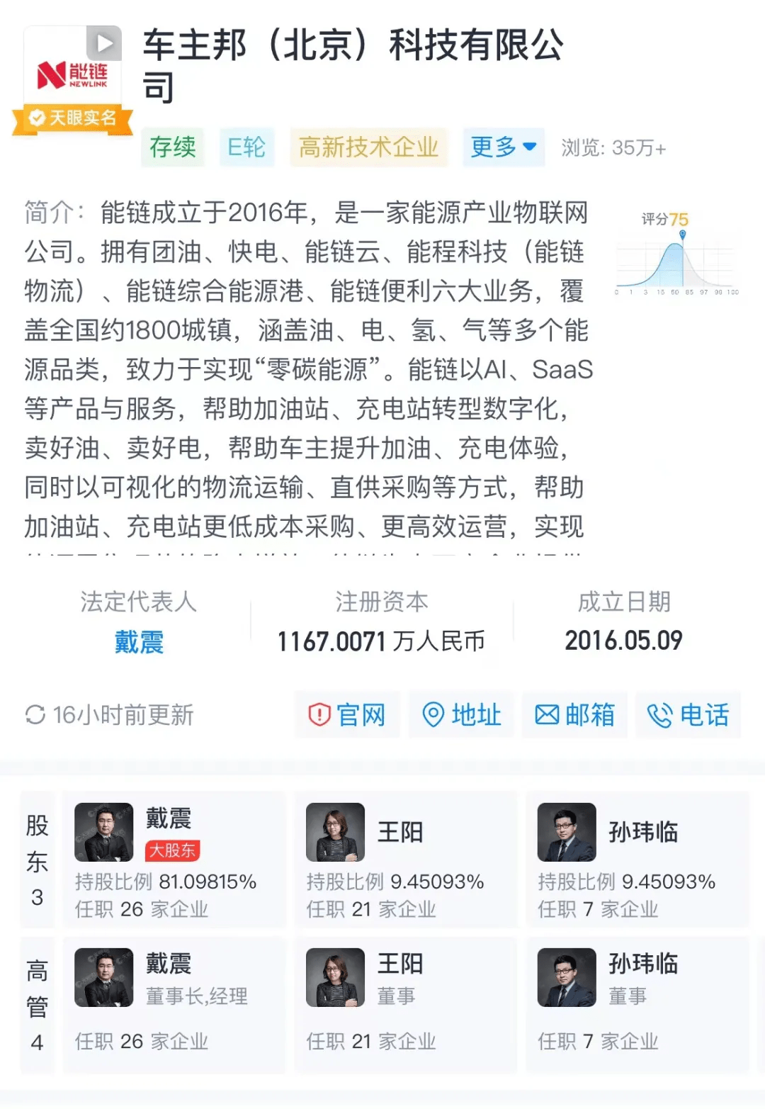 公開信息顯示,車主邦的三位股東中,戴震為能鏈集團創始人、CEO,王陽為能鏈集團聯合創始人、總裁,孫瑋臨為能鏈集團聯合創始人。