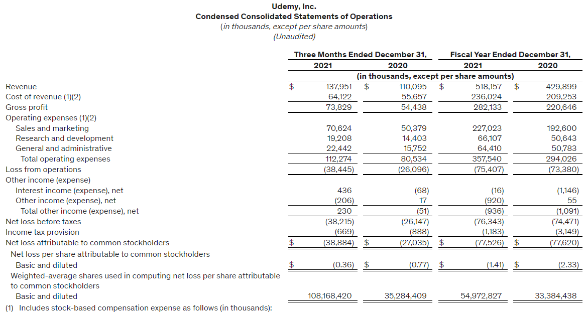2021年全年,Udemy總營收5.18億美元,同比增長21%;毛利潤2.82億美元,2020年為2.21億美元;凈虧損7750萬美元。調整后的息稅折舊攤銷前利潤為虧損2540萬美元,2020年同期為虧損3070萬美元。現金及現金等價物為5.34億美元。