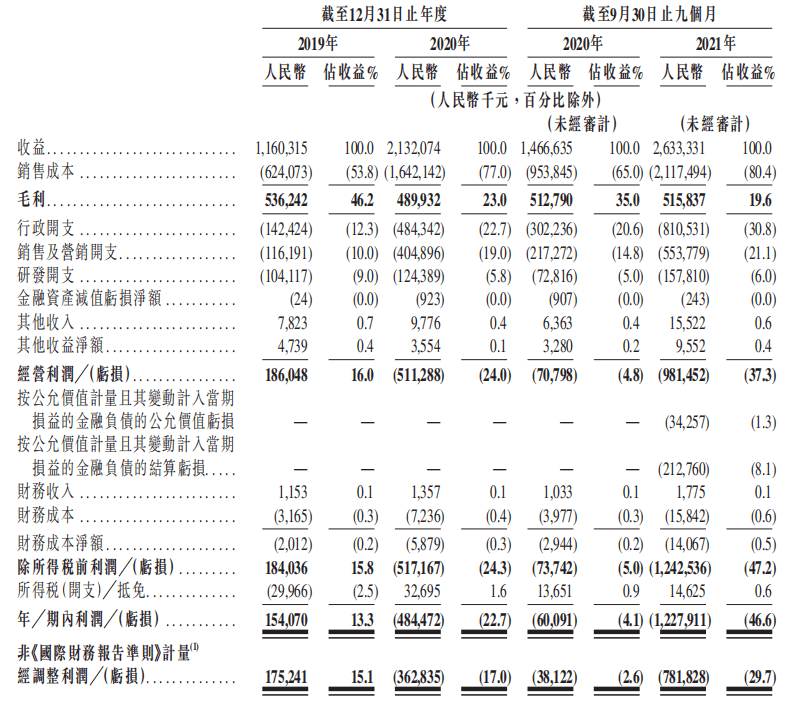 招股書顯示,粉筆科技2019年、2020年的收益分別為人民幣11.6億元、21.32億元,2020年1-9月和2021年1-9月的收益分別為人民幣14.66億元、26.33億元,分別同比增長83.8%和79.5%。