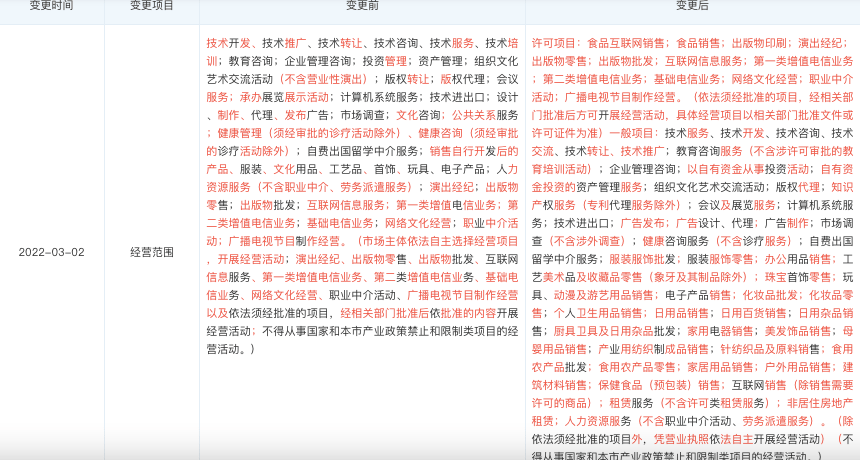 芥末堆文 天眼查網站顯示,3月2日,高途教育科技集團有限公司發生工商變更,經營范圍新增食品互聯網銷售、食品銷售、化妝品批發零售、日用百貨銷售、食用農產品批發零售、非居住房地產租賃等。