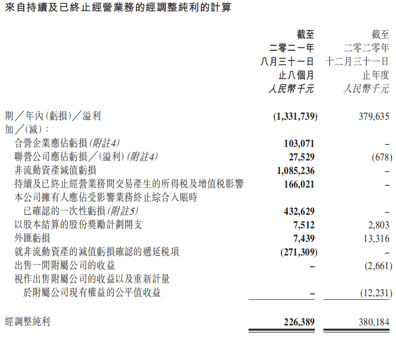 對(duì)于非流動(dòng)資產(chǎn)減值虧損,報(bào)告提到,由于公司受影響業(yè)務(wù)已于2021年8月31日終止綜合入賬,若干物業(yè)、廠房、設(shè)備以及使用權(quán)資產(chǎn)被受影響業(yè)務(wù)占用,公司無法向受影響業(yè)務(wù)收取使用這些資產(chǎn)的租金,根據(jù)減值虧損評(píng)估,確認(rèn)非流動(dòng)資產(chǎn)減值虧損10.85億元。