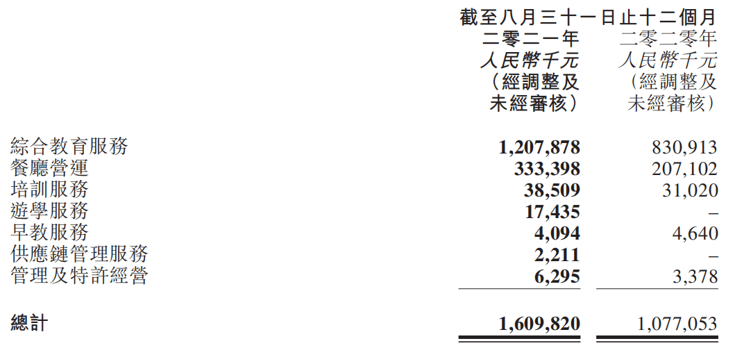 天立教育成立于2002年,其收益包括綜合教育服務(wù)、餐廳營(yíng)運(yùn)、游學(xué)服務(wù)、管理及特許經(jīng)營(yíng)及供應(yīng)鏈管理服務(wù)。報(bào)告提到,公司2021年度(1-8月)收益較2020年度(1-12月)收益減少19.1%,原因系報(bào)告期較去年少了四個(gè)月。報(bào)告顯示,公司的財(cái)政年度結(jié)算日已由12月31日更改為8月31日,以使公司的財(cái)政年度與其在中國(guó)營(yíng)運(yùn)的學(xué)校學(xué)年保持一致。