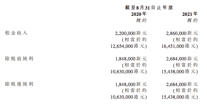 該物業(yè)于2021年8月31日的賬面值約為人民幣3.11億元(約3.85億港元)。截至2020年及2021年8月31日止年度,該物業(yè)應(yīng)占未經(jīng)審核租金收入以及除稅前及除稅后純利如下: