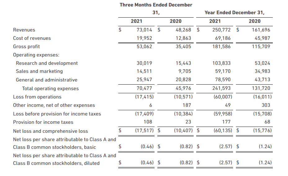 2021財年,多鄰國總營收為2.508億美元,相比2020年的1.617億美元增長了55%,其中營收成本為6918.6萬美元。毛利方面,多鄰國2021年財年毛利為1.816億美元,2020年為1.157億美元,同比增長57%。