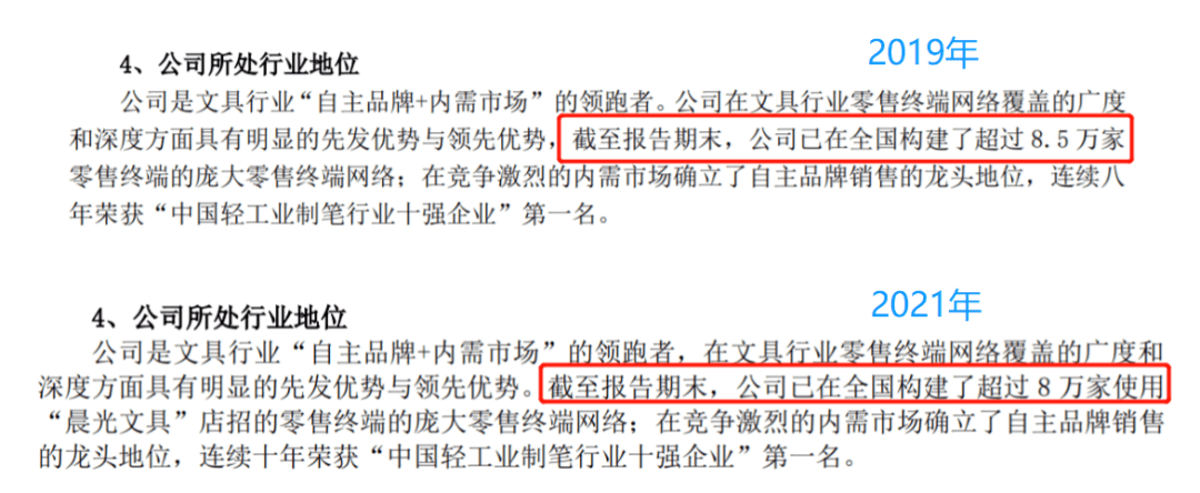 行至當下,晨光股份的這部分業務開始面臨增長“乏力”的問題。這一點可以從門店數量上看出。截至2021年底,晨光股份在全國擁有36家一級合作伙伴、覆蓋1200個城市的二、三級合作伙伴和大客戶,超8萬家使用“晨光文具”店招的零售終端。但在2019年,其零售終端尚且還有8.5萬家——近幾年不但沒有增長,還因為疫情出現了一定的下滑。