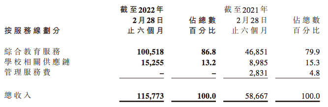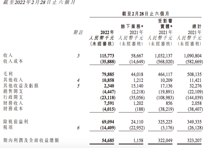 營收1.16億元,同比減少89.4%。營收全部來自于余下業務,余下業務上年同期為5866.7萬元,同比增長97.3%,主要由于2022年寒假期間其大幅增加舉辦各類活動所致。具體來看,余下業務的收入全部來自配套服務收入,包括:(i)綜合教育服務,主要包括提供課外活動及課后托管項目、校巴服務、社會實踐、夏令營及冬令營;及(ii)學校相關供應鏈,主要包括銷售日常必需品及其他教育材料。