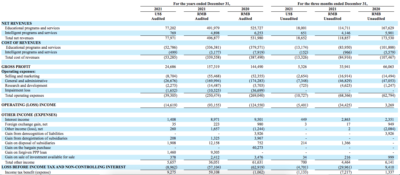 營收1.189億元,上年同期為1.735億元。下降的主要原因是公司K12學(xué)校業(yè)務(wù)受從2021年9月開始生效的修訂的《實施條例》影響,以及2021年下半年輔導(dǎo)業(yè)務(wù)的監(jiān)管變化。