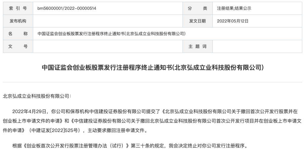 2022年5月12日,中國證監會發布了《創業板股票發行注冊程序終止通知書》,聲明弘成立業在4月29日主動提交了《北京弘成立業科技股份有限公司關于撤回首次公開發行股票并在創業板上市申請文件的申請》和《中信建投證券股份有限公司關于撤回北京弘成立業科技股份有限公司首次公開發行項目并在創業板上市申請文件的申請》,主動要求撤回注冊申請文件。