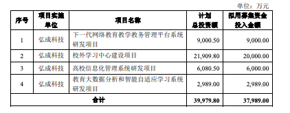 在此次發布的招股書中,弘成立業表示,發行募集資金將用于下一代網絡教育教學教務管理平臺系統研發項目、校外學習中心建設項目等。