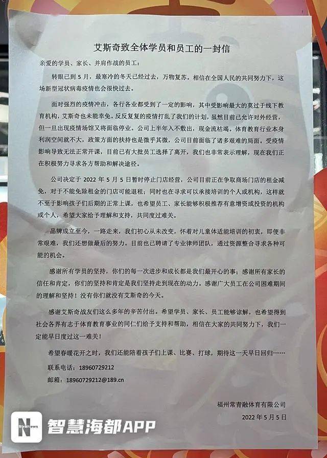 5月5日,林女士趕到艾斯奇五一路店,看到大門緊閉,門前只貼著一張告示《艾斯奇致全體學(xué)員和員工的一封信》,聲稱公司上半年入不敷出,面臨諸多難題。目前已有大批員工選擇了離開,公司決定暫停門店經(jīng)營,同時也在尋求可以承接培訓(xùn)的個人或機(jī)構(gòu),這樣不至于影響孩子們后期正常上課。