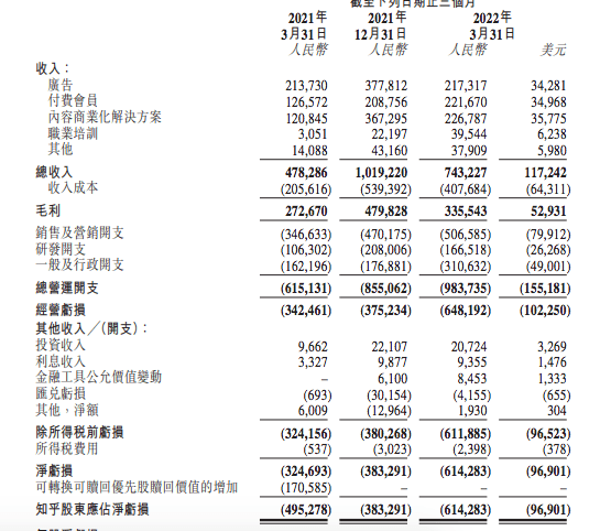 知乎2022財年Q1未經審計財務業(yè)績摘要: