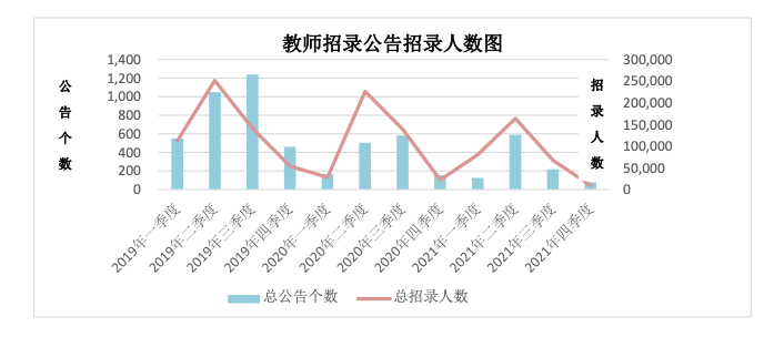 其次,教師序列在經歷了2019年的擴招后,近兩年呈現下降趨勢。如下圖可知,教師序列2021年公告個數、招錄人數均低于2019年和2020年。