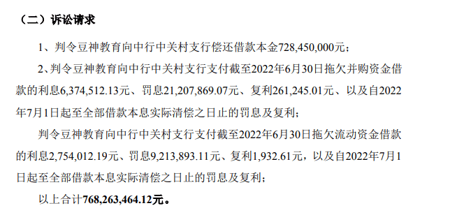 截至目前,豆神教育仍未償還借款并支付利息、罰息及復(fù)利,各擔(dān)保人亦未依據(jù)各項(xiàng)擔(dān)保合同的約定履行其擔(dān)保責(zé)任。就此,中行中關(guān)村支行向法院提起訴訟,各項(xiàng)訴訟請(qǐng)求合計(jì)涉及金額為7.68億元。