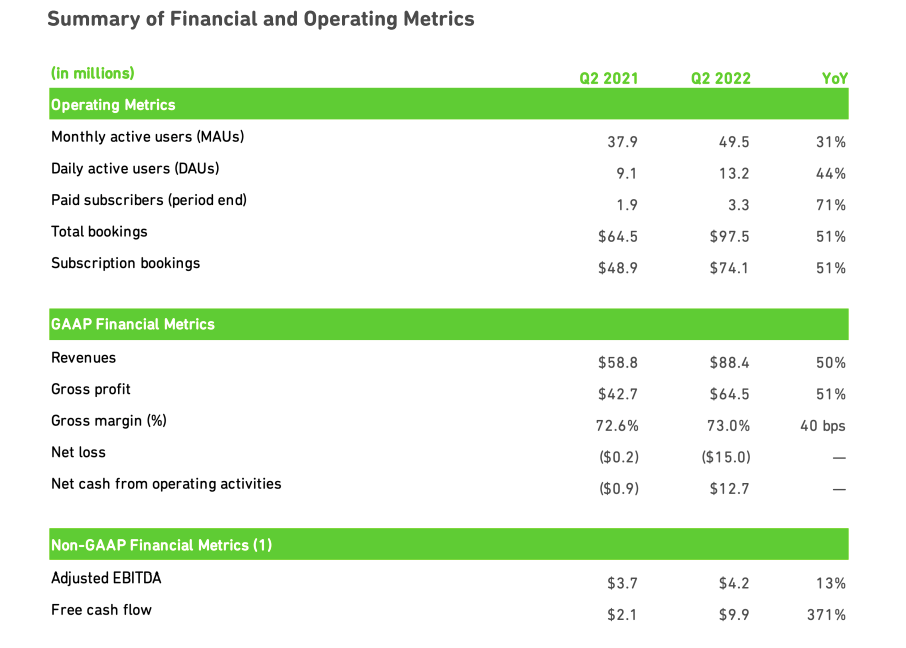 2022年第二季度,多鄰國的總預(yù)訂額(total bookings)為9750萬美元,同比增長51%。其中訂閱預(yù)訂額(Subion bookings)為7410萬美元,約占總預(yù)訂額的76%。