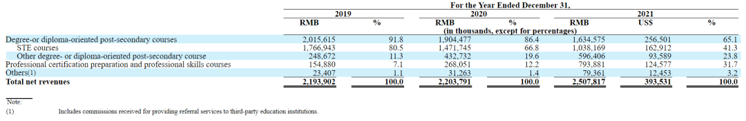 其中,成人自考培訓業務正處在下行周期。其營收從2019年的17.67億元,減少到2021年的10.38億元,下滑了41.2%。這項業務的占比急劇減少。2019年,這部分業務占全年總營收80.5%;而到2021年,這部分業務占比只有41.3%。