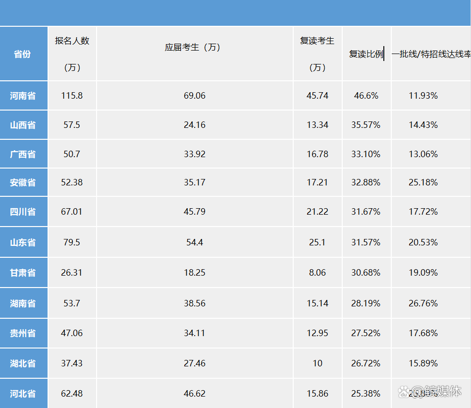 近五年來,全國高考復讀率從約18%上漲至近30%,上表中各省份、地區的高考平均復讀率為27.3%。其中,河南、山西、廣西、安徽、四川、山東、甘肅這些歷年報名人數眾多、競爭激烈的高考大省在今年的考生復讀率已超30%,河南省的復讀考生甚至快達到了一半。