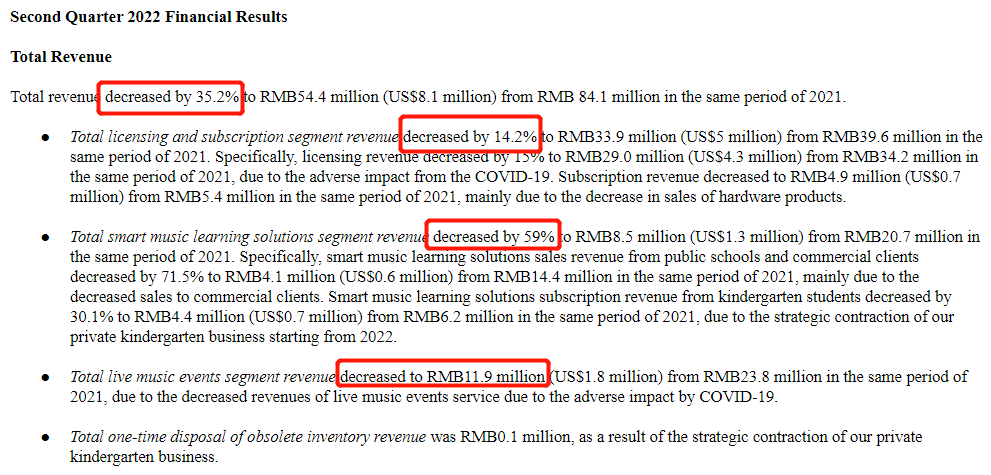 2022年第二季度,音樂許可和訂閱實現(xiàn)收入3390萬元,同比下降14.2%。智能音樂學(xué)習(xí)解決方案部門收入從2021年同期的2070萬元下降59%至850萬元。現(xiàn)場音樂活動服務(wù)收入也出現(xiàn)下滑,期內(nèi)實現(xiàn)1190萬元,同比下降50%。