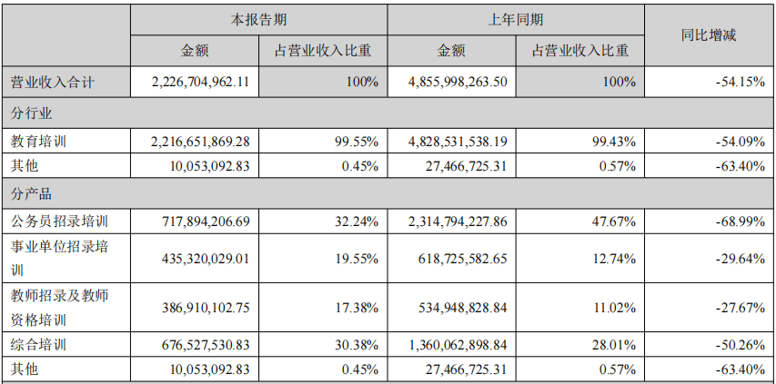 分產品來看,公務員招錄培訓營收7.18億元,占總營收的32.24%,同比下降68.99%;事業單位招錄培訓營收4.35億元,占總營收的19.55%,同比下降29.64%;教師招錄及教師資格培訓營收3.87億元,占總營收的17.38%,同比下降27.67%。綜合培訓營收6.77億元,占總營收的30.38%,同比下降50.26%;其他營收1005.31萬元,占總營收的0.45%,同比下降63.4%。