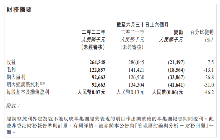 芥末堆文 9月1日,華南職業教育集團(06913.HK)公布了截至2022年6月30日止六個月的中期財務報告。報告期內,華南職業教育實現收益2.65億元,同比減少7.5%;期內溢利9266萬元,同比減少26.8%。