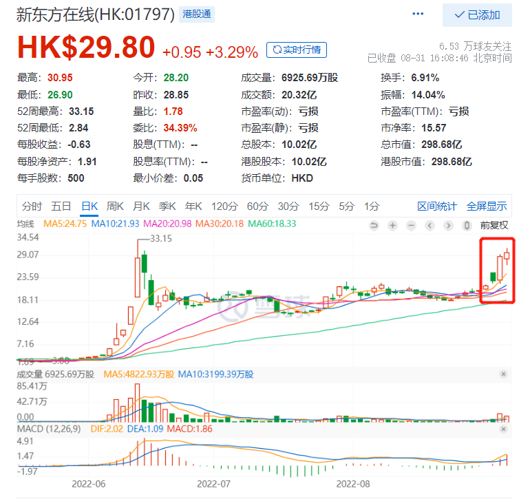 但自8月19日以來,新東方在線股價連續8個交易日上漲,8月30日更是逆市走強引領教育股上漲,單日大漲超26.26%。8月31日盤中,新東方在線一度站上30港元大關,接近年內新高。股價上漲,除了業績虧損同比收窄,或許還和新東方在線CFO尹強透露的東方甄選業績數據有關。