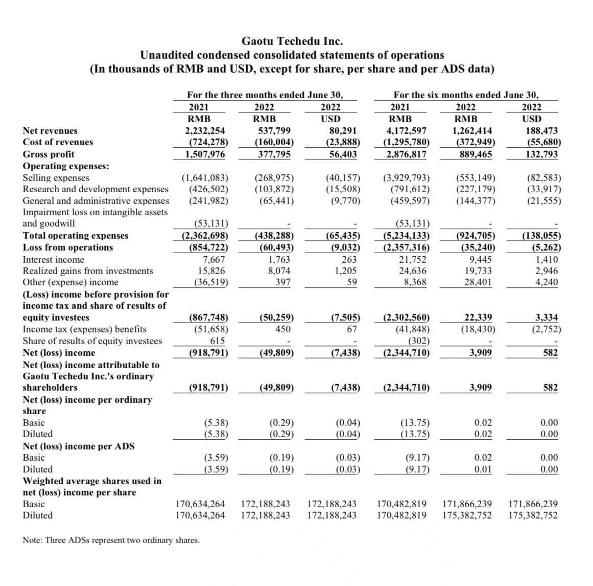 芥末堆文 9月8日,高途(NYSE:GOTU)公布2022年第二季度和上半年業績。