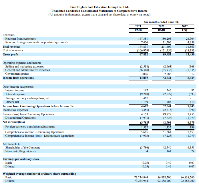 芥末堆文 日前,第一高中教育集團(NYSE: FHS)發布截至2022年6月30日的2022年上半年度未經審計財報。報告期內,總收入為人民幣2.114億元,較2021年上半年的人民幣1.748億元增長20.9%。毛利為人民幣9000萬元,較2021年上半年的人民幣6790萬元增長32.6%。