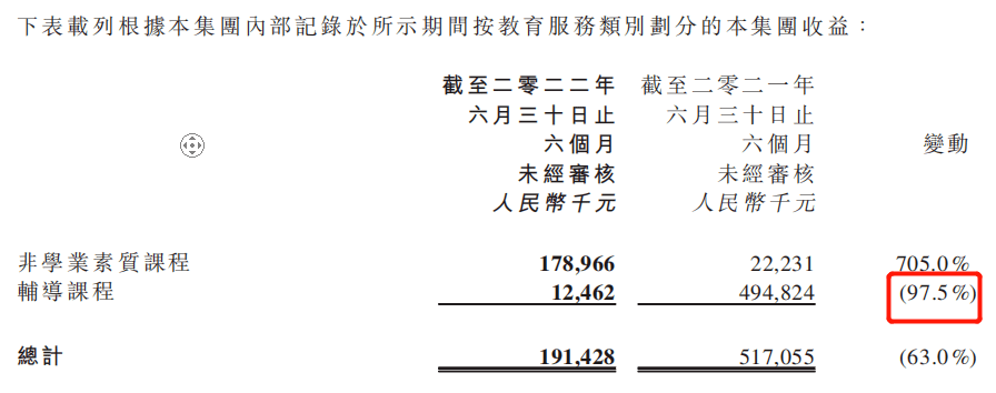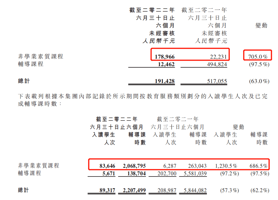 盡管增長的數字亮眼,但不可忽略的是,高增長率更多是建立在2021年前素質課程規模較小的基礎上。學業輔導課程在2021年上半年帶來了4.95億元收入,與之相比,素質教育帶來的收入遠遠無法填補剝離K12業務造成的營收缺口。