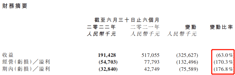 2022年上半年,公司錄得虧損3284萬元,去年同期利潤為4274.9萬元,同比由盈轉虧。期內公司實現毛利6458萬元,與去年同期相比驟降66.45%,毛利率為33.7%,同比也有所下降。